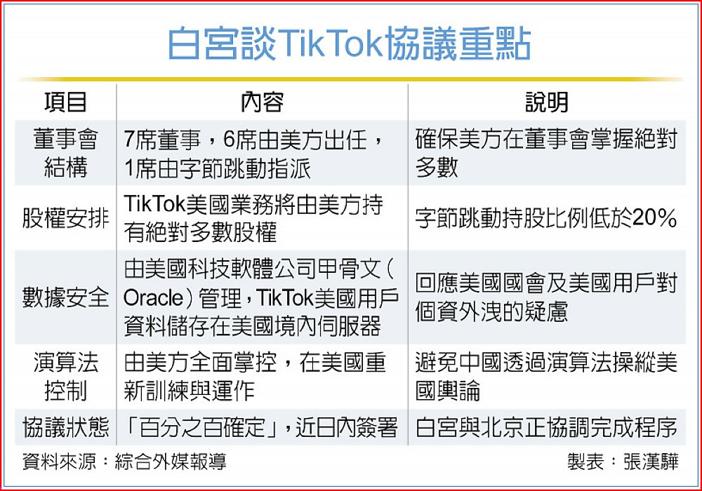 中美兩國元首19日進行「習川通話」後,TikTok在美國的命運逐漸明朗。美國白宮發言人李維特(Karoline Leavitt)20日透露,中美達成TikTok協議中,美國業務董事會將設7席董事,美方掌握6席,字節跳動僅1席,美企將掌控核心演算法,所有美國用戶資料由甲骨文(Oracle)在美國境內伺服器管理,以確保數據安全與隱私。她強調協議已「百分之百確定」,預計近日內簽署。