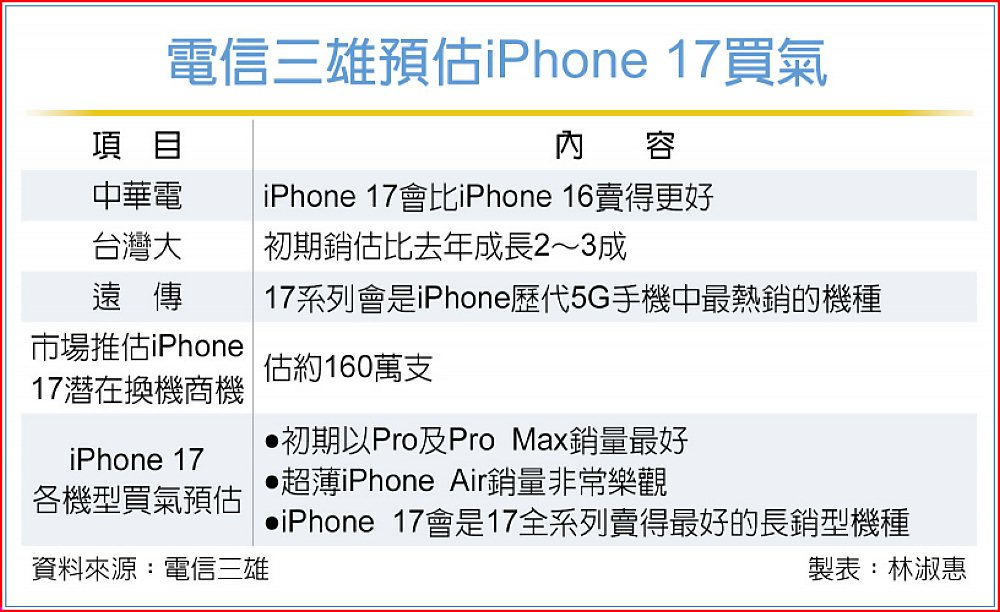 電信三雄最新統計,iPhone 17首賣會創佳績,首日銷量估較去年同期成長,台灣大估約增長2~3成。各系列機型又以Pro 256GB最受歡迎,新色宇宙橙最吸睛。
