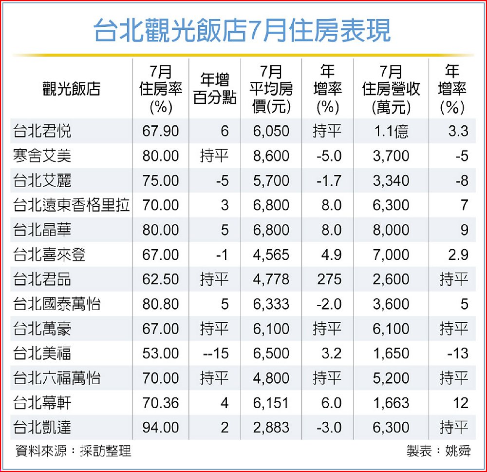 台北國泰萬怡酒店7月均房價年減2%,但接到外國旅行團入住,7月平均住房率年增5個百分點,推升住房營收年增5%。