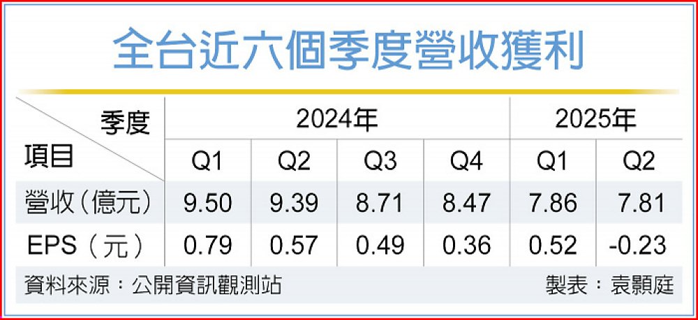 全台前八月累計合併營收21.03億元,年減15.35%,上半年獲利來看,毛利率提升到24%,營業利益1.19億元,年減13.14%。第二季匯損衝擊大,稅後純益4,228萬元,年減79.3%,每股稅後純益0.28元。