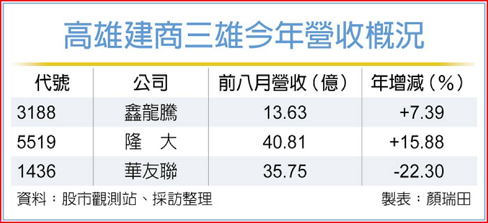 高雄房市雖冷風直吹,但鑫龍騰(3188)、隆大(5519)、華友聯(1436)受三~四年前房市景氣的預售屋表現激勵,今年各有建案完工交屋,貢獻營收,鑫龍騰今年全年營收可望挑戰新高,隆大和華友聯則將挑戰歷史次高,高雄營建三雄今年營收唱高調。