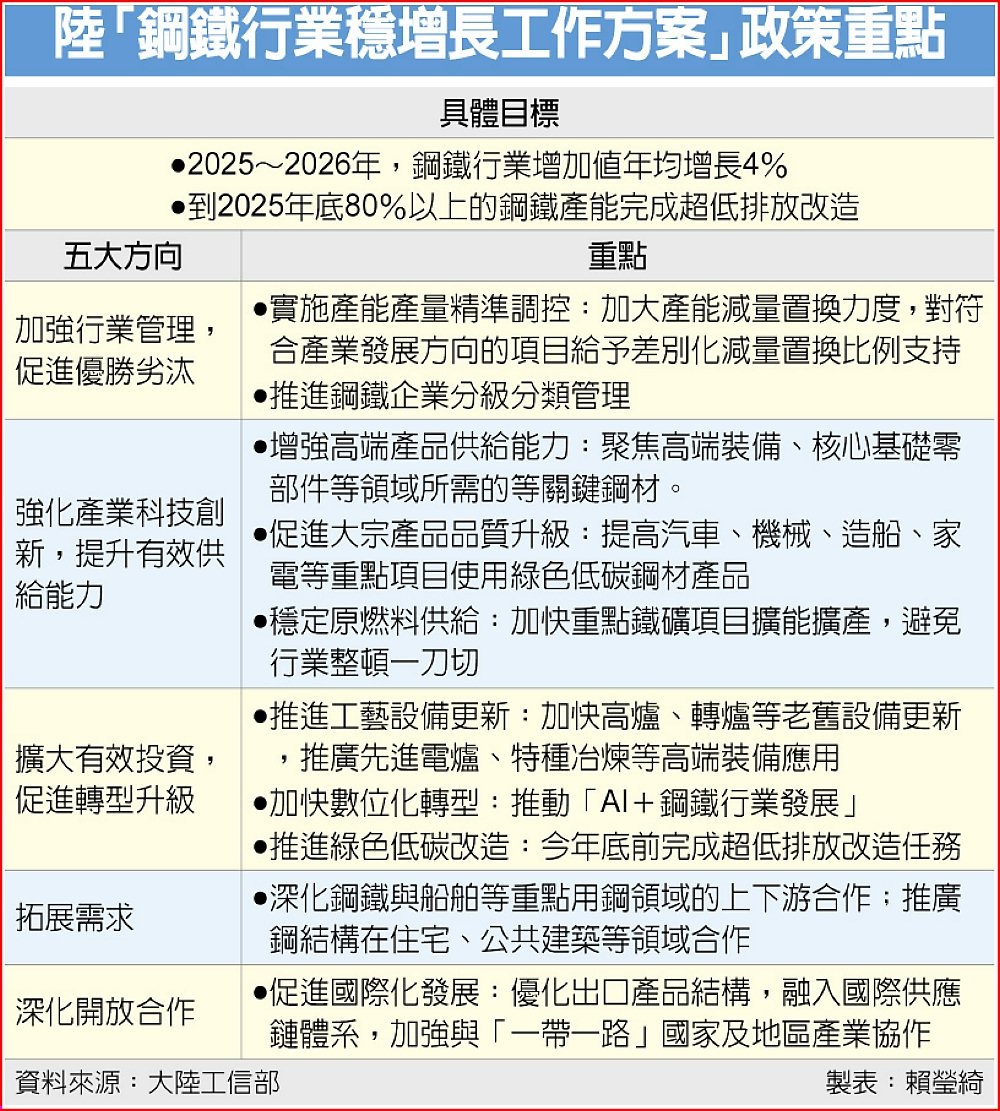 中鋼分析,大陸鋼鐵業併購重組也同步深化,今年發布新版《鋼鐵業規範條件》已將重組整併納入「高效化」指標,明確鼓勵跨區域、跨所有權整合。在政策與市場雙重驅動下,整併不再是單純規模擴張,是朝價值提升與產業重構邁進。