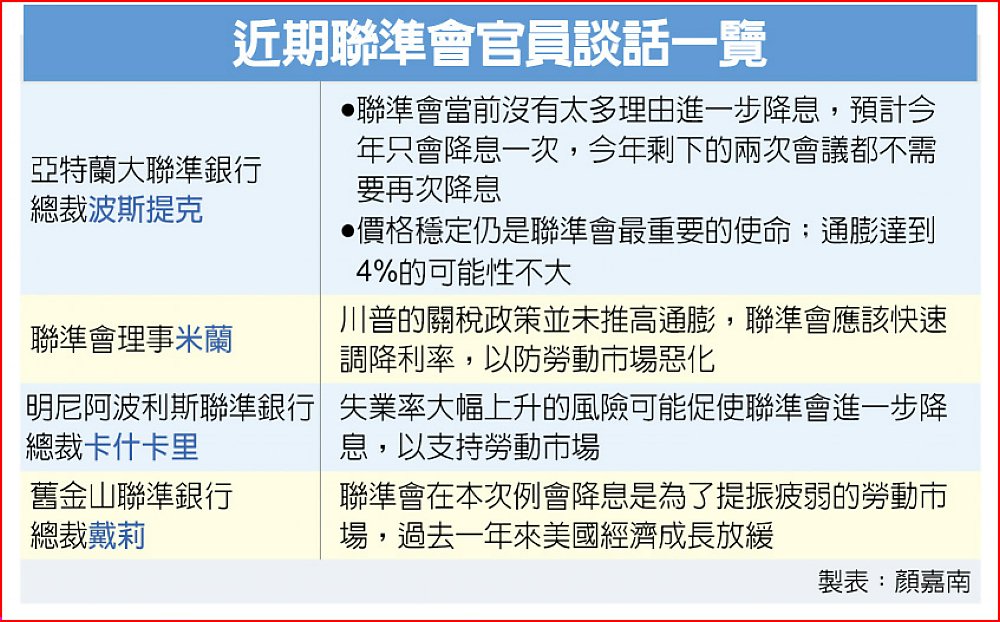 卡什卡里強調,關稅造成通膨急速躥揚的風險很小。聯準會新任理事米蘭的看法與卡什卡里相呼應,強調關稅政策並未推高通膨,聯準會應快速調降利率以防勞動市場惡化。米蘭是9月貨幣政策會議唯一投票降息2碼的聯準會官員。(相關新聞見A11)
