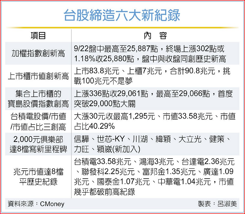台股多頭氣盛,再寫六大新紀錄,包括1.加權指數盤中與收盤再創新高;2.上市櫃市值合計90.8兆元創新高;3.寶島股價指數創高並站上29,000點;4.台積電股價/市值/市值占比三創歷史新高;5.2,000元俱樂部達八檔新里程碑;6.兆元市值達八檔創平高,各檔市值幾乎都突破前高或新高。