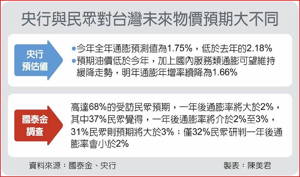 楊金龍表示,展望明年,國際機構預期油價低於今年,加上國內服務類通膨可望維持緩降走勢,央行預測明年台灣CPI及核心CPI年增率分別續降為1.66%、1.64%。換言之,央行認為,不論是今年或明年,全年通膨率都會低於2%通膨警戒線,和民眾較悲觀的預期明顯大不同。