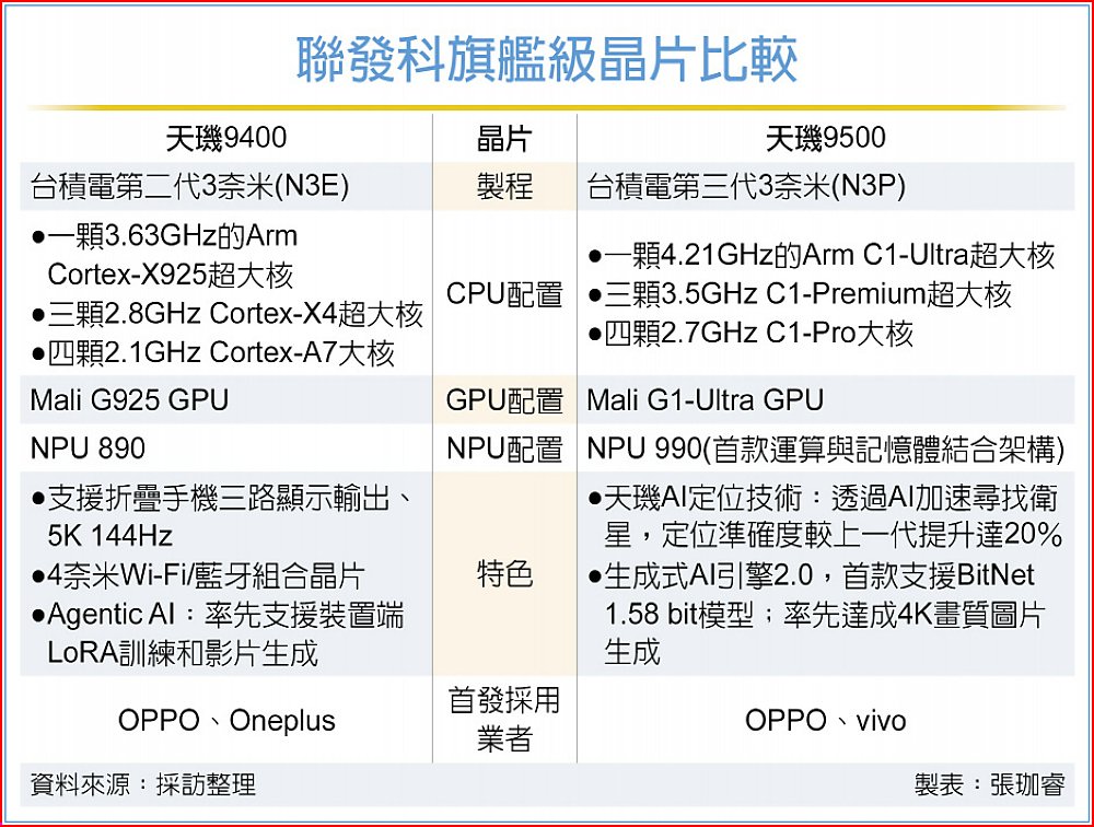 IC設計大廠聯發科22日正式發表新一代旗艦5G行動處理器天璣9500,採台積電最新第三代3奈米(N3P)製程,在CPU、GPU及NPU三大核心架構全面升級下,單核效能劍指蘋果A19 Pro水準。總經理陳冠州指出,聯發科將繼續與台積電合作,並規劃在美國亞利桑那州廠投片,以滿足客戶需求。