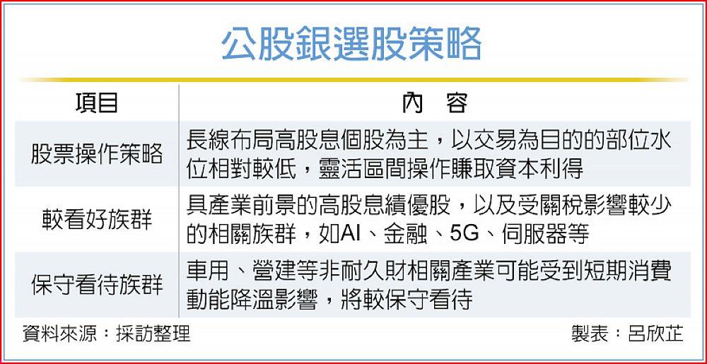 選股方面,合庫銀行指出,將選擇具產業前景的高股息績優股分批建置;臺灣銀行說明,將伺機布局產業前景良好、獲利轉佳及受關稅影響較少的相關族群,如AI、金融、5G、伺服器等;土地銀行則提到,將優先挑選需求有支撐的產業類型,例如AI伺服器供應鏈,而車用、營建等非耐久財相關產業可能受到短期消費動能降溫影響,將較保守看待。