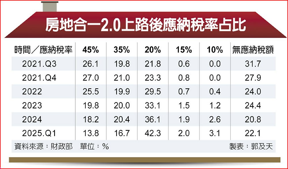 房地合一稅2.0政策上路四年後,對抑制房產短期炒作交易發揮成效。據財政部統計,房產交易中,持有2年內(須課45%稅率)、持有2~5年(須課35%稅率)的占比大減,兩者合計占比從新制剛上路時的48%,迄今已降至30.5%。