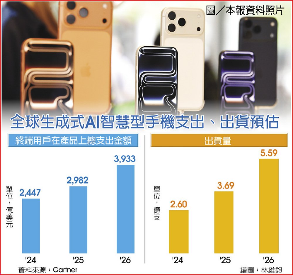 下半年手機旗艦新品相繼問世,且主打更完善AI應用生態系,根據國際研調機構Gartner最新研究,2025年全球終端使用者在生成式AI(GenAI)智慧型手機上的支出將達到2,982億美元,約占整體AI終端使用者支出的20%,而今年生成式AI智慧手機出貨數量預計將上看3.69億支。