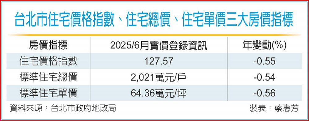 北市地政局22日公布6月「實價登錄價量動態」指出,6月住宅價格指數127.57、月跌0.38%,創下近14個月最低紀錄,回到去年4月水準,年跌幅約0.55%;標準住宅總價方面,平均每戶約2,021萬元、跌至近14個月最低量;至於標準住宅單價,每坪64.36萬元、跌至近12月新低,三大價格指標都同步衰退。
