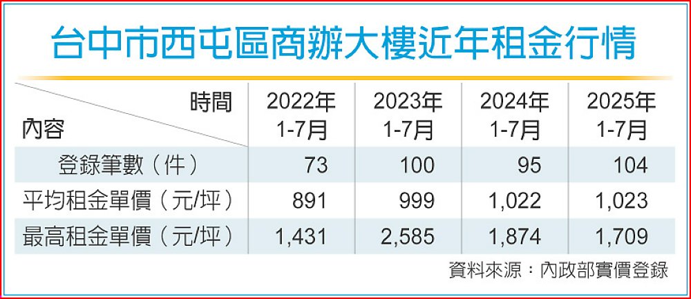 據實登資料顯示,台中西屯區近四年商辦大樓租賃件數逐年增加,累計超過560家新租客進駐,租金單價平均漲幅約15%;七期新市政中心,租金穩居每坪千元以上,如「聯聚中雍大廈」、「CBD時代廣場」、「NTC國家商貿中心」等,最高租賃行情落在每坪2,300至2,900元之間。