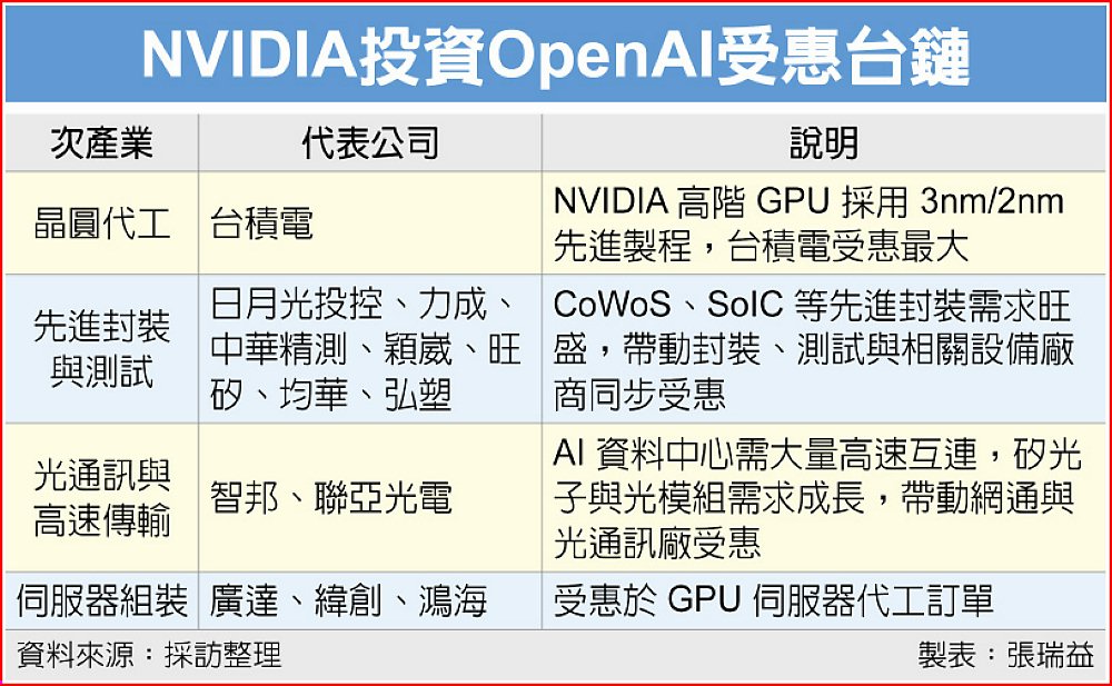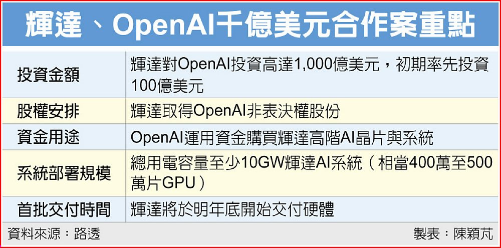 AI晶片和模型應用兩大龍頭強強聯手!輝達23日宣布對OpenAI投資高達1,000億美元,將向OpenAI提供其資料中心運算所需的先進晶片與系統,協助部署總用電容量至少10GW、約400萬至500萬片GPU的AI運算基礎設施,震撼全球產業。