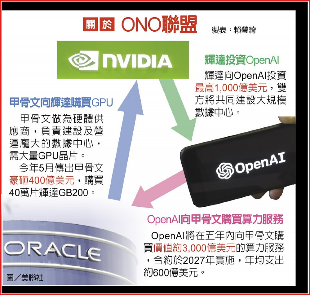 輝達(NVIDIA)宣布向OpenAI投資1,000億美元,聚集三大巨頭的AI產業大聯盟正在成形,即由輝達率領甲骨文及OpenAI的「ONO」聯盟。三家科技巨頭正透過一連串動輒千億美元的巨額合作,建構下一代AI算力帝國。