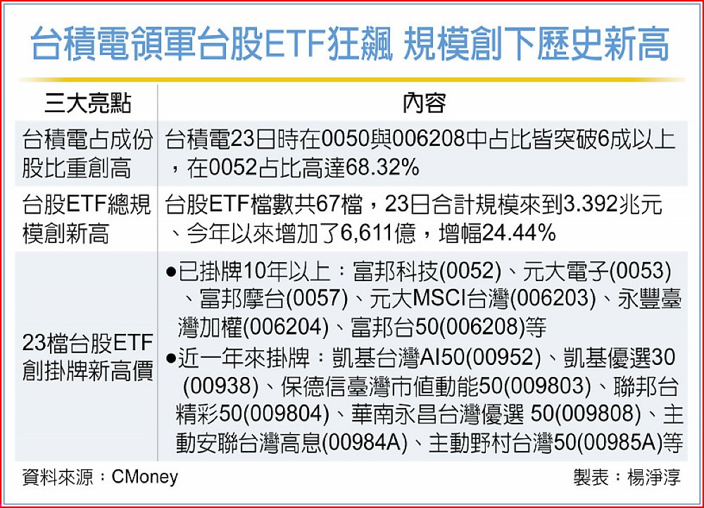 首先,台積電持續創高,於台股市值比重高達41.11%,且於多檔ETF中的成份股占比也愈來愈高,在元大台灣50與富邦台50中占比皆突破6成以上;第二,隨著台股創新高,加上新資金持續湧入,新ETF持續掛牌帶動下,加上主動式ETF在內,已有9檔台股ETF掛牌,總計檔數來到67檔之多,23日合計規模來到3.392兆元,再創歷史新高。