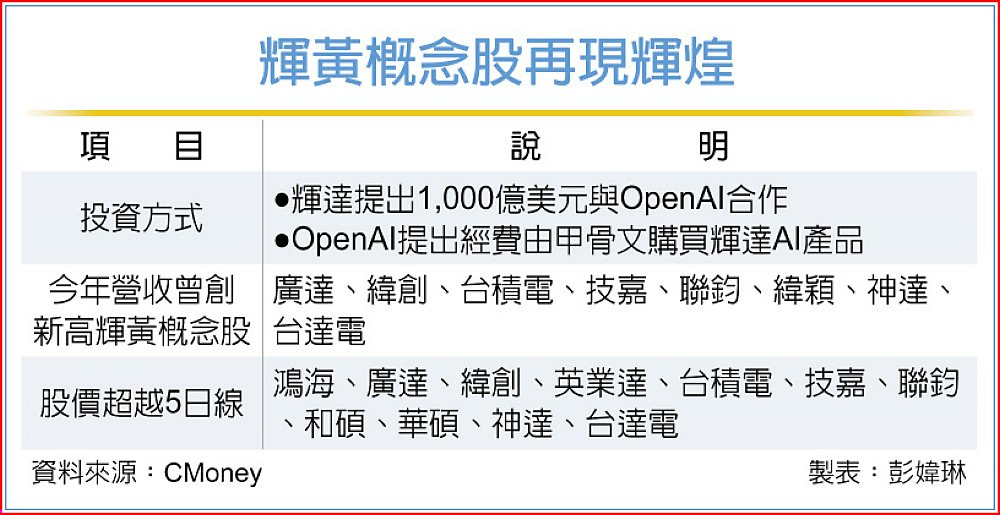 輝達執行長黃仁勳大手宣布投資1,000億美元,和OpenAI開發10GW的超級AI資料中心,訓練和運行下一代AI模型,台股「輝黃供應鏈」23日跟著牛氣沖天,在外資搶進下,包括台積電、廣達、鴻海、緯穎、英業達、緯創、技嘉等主要「老黃概念股」不僅大部分股價超越5日線,台積電股價更是再創新高1,340元。