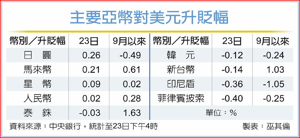 主要亞幣23日漲跌互見,日圓升值0.26%、馬來幣升0.21%、星幣升0.09%,人民幣升0.02%;泰銖貶0.03%、韓元貶0.12%、新台幣貶0.14%、印尼盾貶0.36%、菲律賓披索貶0.4%。
