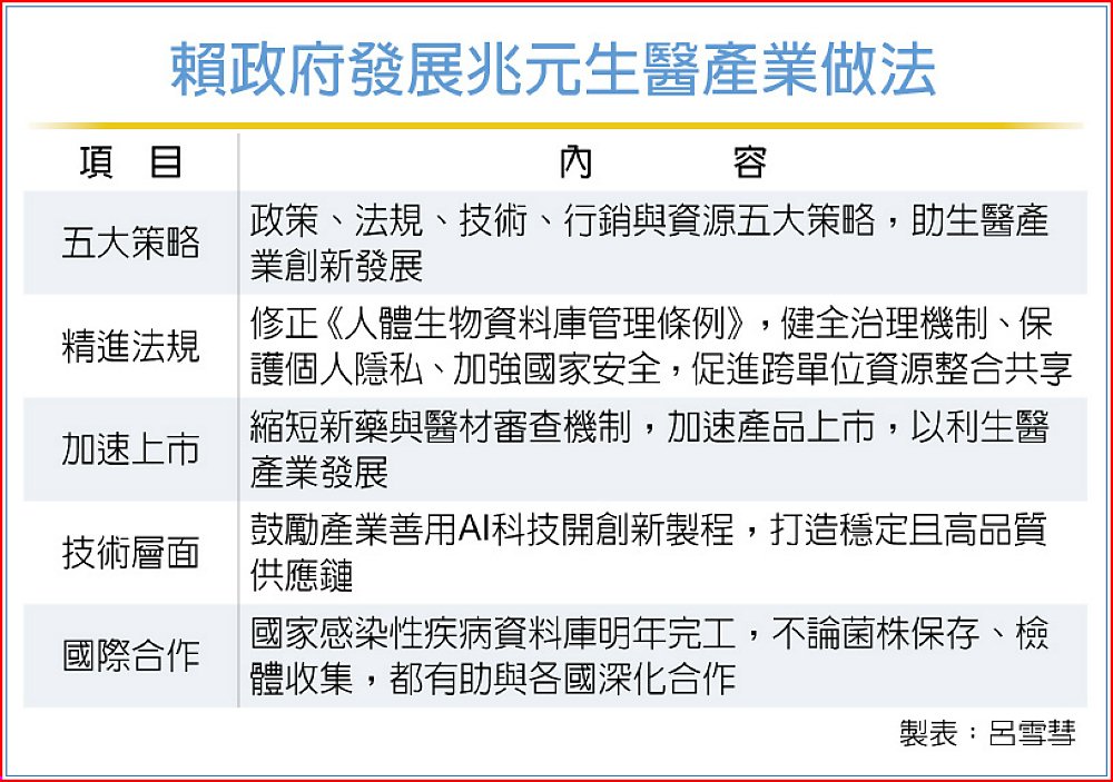 他表示,現在政府已針對政策、法規、技術、行銷與資源,提出五大策略協助生醫產業創新發展。像是「國家希望工程」已納入生醫產業,且隨著生技產業策略諮議委員會提出多項建議,為產業規劃發展藍圖。同時,政府持續精進《人體生物資料庫管理條例》等法規以及新藥與醫材審查機制,加速產品上市、協助台灣與國際接軌。