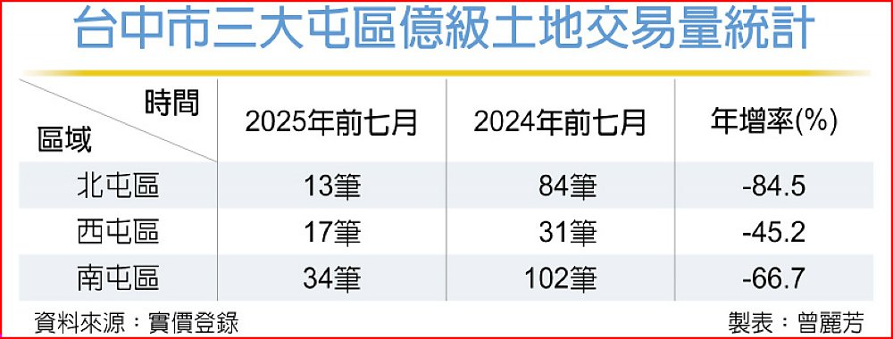 觀察前七月台中三大屯區土地交易,北屯區僅13筆交易,相較於去年同期的84筆,暴跌84.5%,是三屯區中縮水最明顯的區域;南屯區34筆,比去年同期的102筆大減66%;西屯區則從31筆掉到17筆,跌逾45%。
