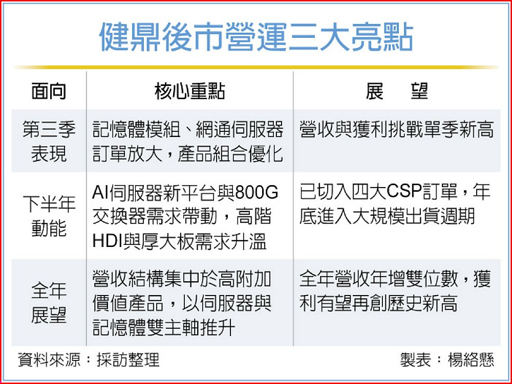健鼎(3044)第三季營運持續升溫,記憶體模組與網通伺服器訂單需求同步放大,加上產品組合朝高毛利方向優化,單季營收有望再寫新猷。據估算,7、8月合計營收124.53億元,若9月維持相近水準,整季季增幅度可望落在中個位數百分比,挑戰單季歷史高點,法人並估,單季EPS可望站上5元,營收與獲利雙雙刷新紀錄。