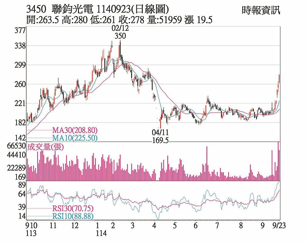 輝達宣布與OpenAI建立1,000億美元戰略合作,OpenAI未來五年將向甲骨文採購3,000億美元算力,市場聯想,聯鈞(3450)為甲骨文光通訊供應商的重要受惠股,致使股價走強。