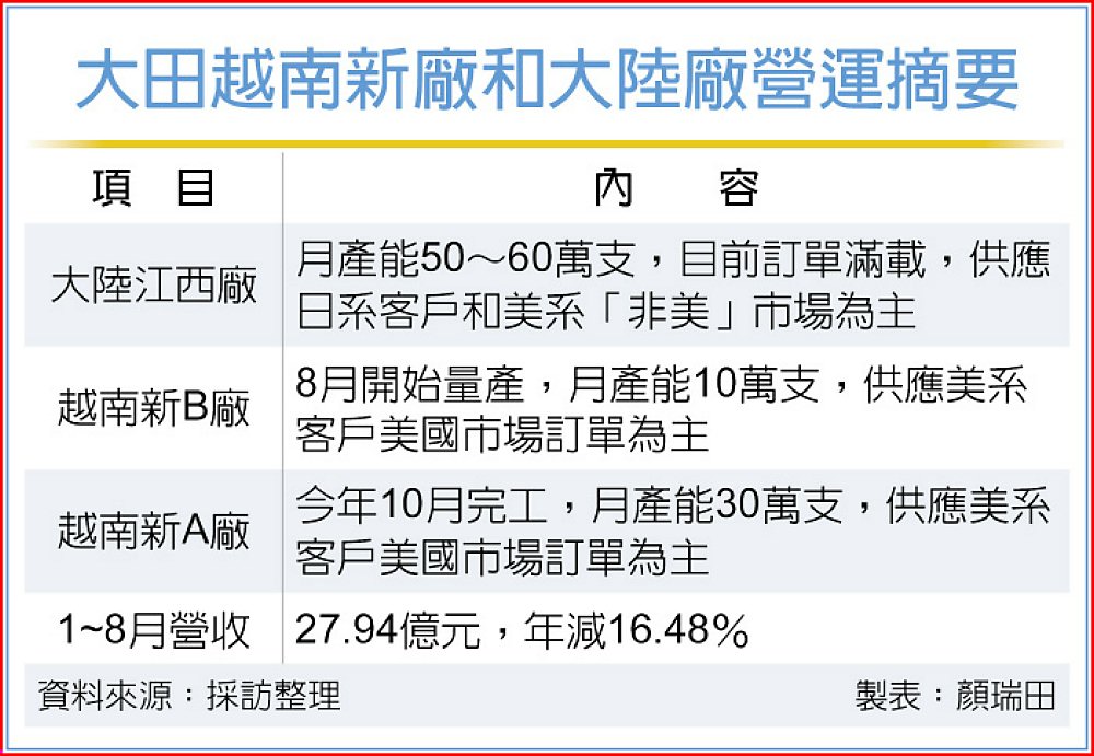 大田原本只有大陸江西廠一個生產基地,規畫月產能約50萬到60萬支,為因應美國對等關稅的挑戰,轉進越南,投資增設二座廠,承租的大田越南B廠,規畫月產能10萬支;越南A廠是由大田購地新建,基地面積6萬多平方公尺,2棟廠房樓地板面積各有2萬多平方公尺,A廠今年8月底封頂,規畫月產能30萬支,越南A廠和B廠明年同步量產之後,產能將達大陸廠的70%以上。