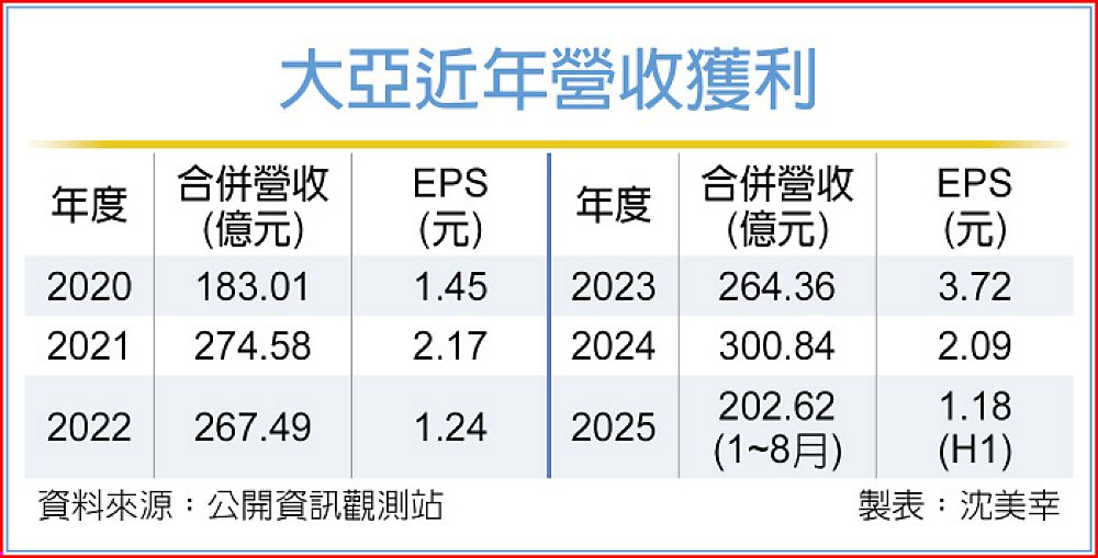 另,大亞的電線電纜續獲台電強韌電網及新增高雄捷運黃線包商釋單,今年電線電纜訂單無虞、產能滿載。