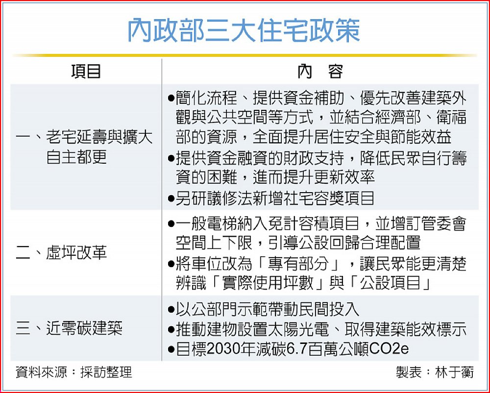 內政部定調老宅延壽與擴大自主都更、虛坪改革,及近零碳建築為三大住宅政策。內政部表示,透過整合科技、法制與產業,將強化住宅政策、擴大內需,發展不動產業,創造出新的經濟動能。與此同時,國土署將研議修正都更容獎辦法,將新增社宅容獎項目,規範符合一定樣態的公辦都更案優先提供社宅,落實居住正義。