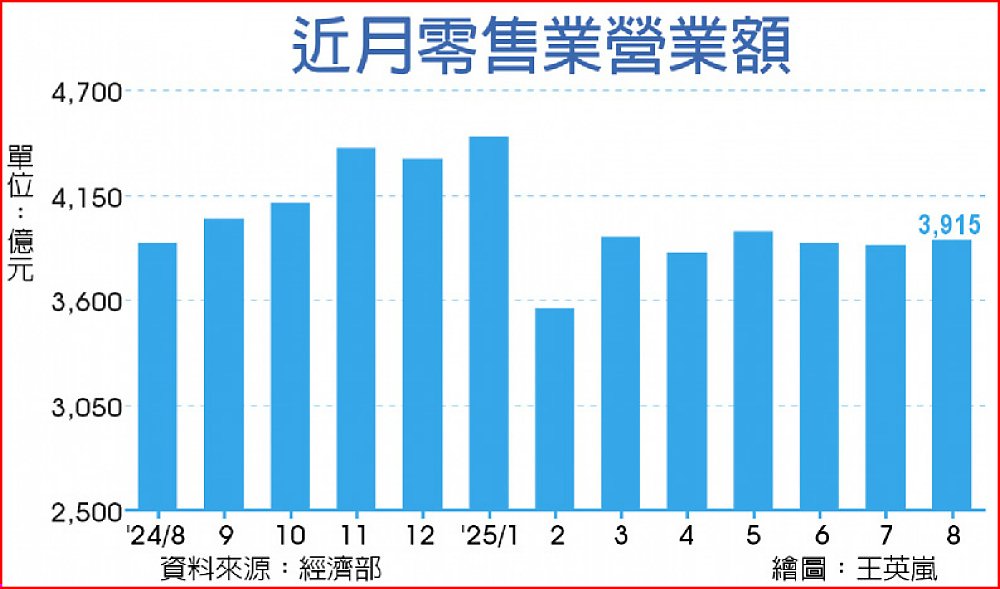 經濟部統計處24日公布8月批發、零售及餐飲業營業額,其中零售業營業額為3,915億元,年增率0.4%,終結連四個月負成長。統計處分析,業者掌握父親節、中元節等節慶採買及暑假出遊商機。但9月有21天為民俗月,預期9月零售業營業額將再轉為負成長。