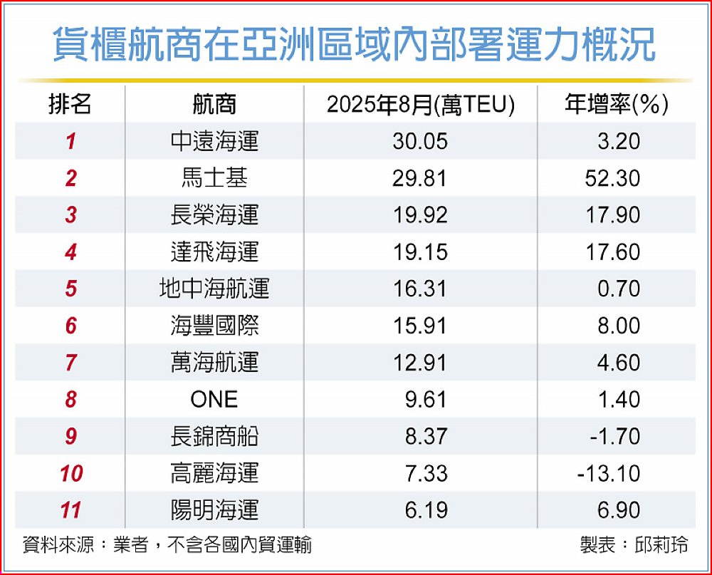 亞洲區間市場向來是亞系航商的大本營,馬士基近一年大動作運力年增約52.3%,在亞洲區間運力部署躍居第二、直逼中遠海運,台灣的貨櫃三雄也持續增加運力使航網布局更完整,其中長榮海運力年增約17.9%、排名第三,11月將推出中國-印尼-麻六甲海峽新航線CIM;萬海年增運力約4.6%、排名第七;陽明運力年增6.9%、排名第11,近期也將開出亞洲區間新航線。