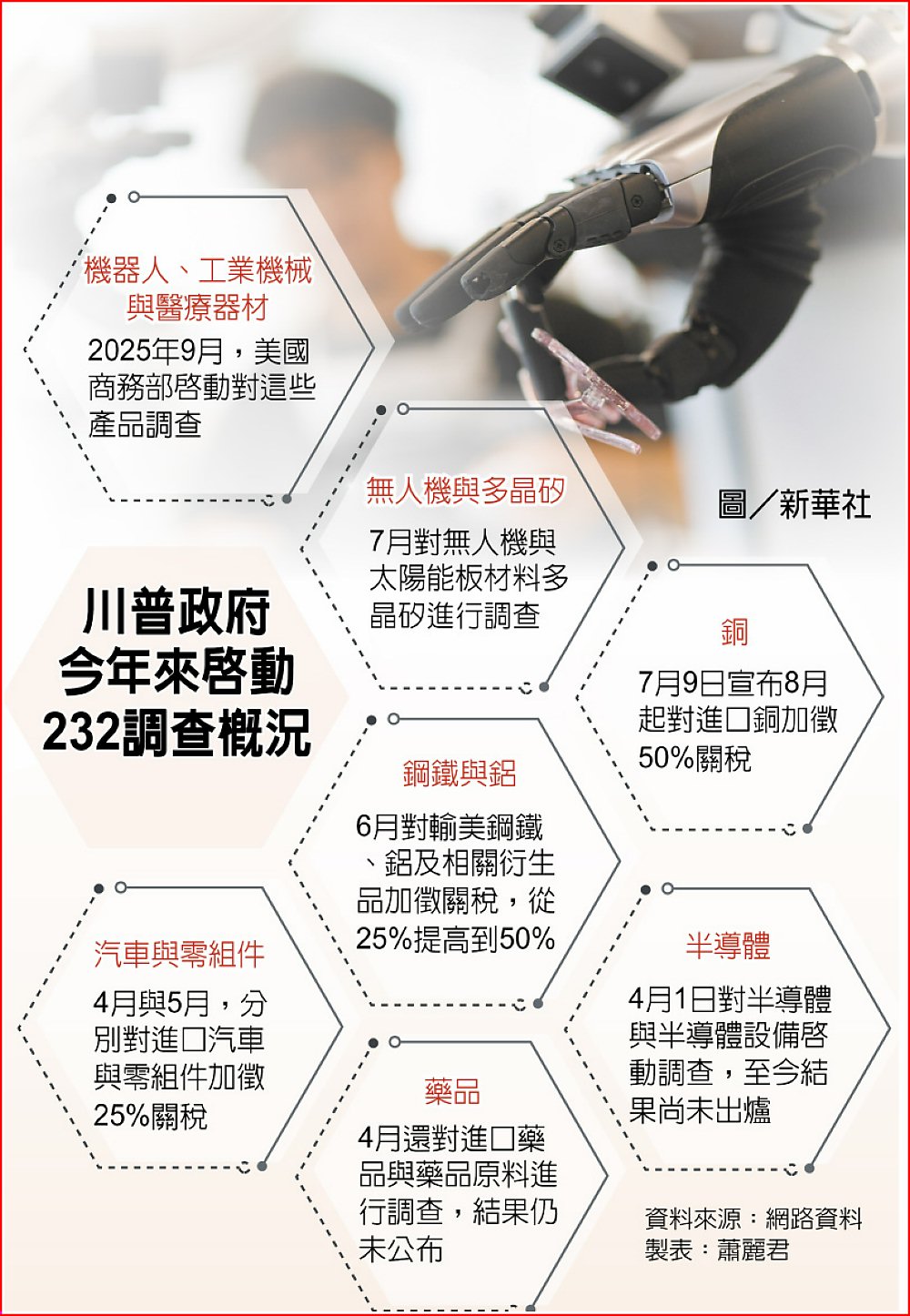 川普政府再度針對進口商品啟動國安調查,美國商務部根據《貿易擴展法》第232條款,擴大調查範圍至鎖定機器人、工業機械和醫療器材,這項行動被被視為是美國為進行新一輪關稅的預備動作。若這些商品遭施加關稅,勢必讓消費者、醫院和製造商蒙受成本增加的衝擊。