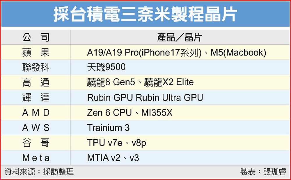 眾多美系晶片業者成台積電忠實客戶。旗艦級手機晶片熱戰開打,三大業者皆以台積電N3P製程打造;PC部分,蘋果M5、高通驍龍X2 Elite,據悉同採台積電3奈米製程;HPC應用方面有輝達Rubin GPU及AMD的MI355X躍躍欲試,AWS Trainium3將於明年初量產。