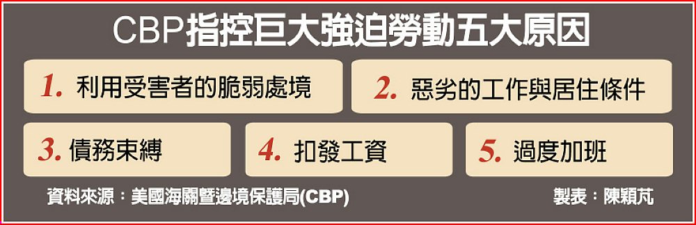 根據CBP稍早發布的聲明,美國政府調查發現巨大存在多項強迫勞動指標,包括濫用勞工弱勢處境、惡劣的工作與生活條件、債務束縛、扣發工資以及過度加班等情形。CBP表示:「巨大透過這些手段獲取不當利潤,使產品價格低於市場價,損害守法的美國企業利益。」