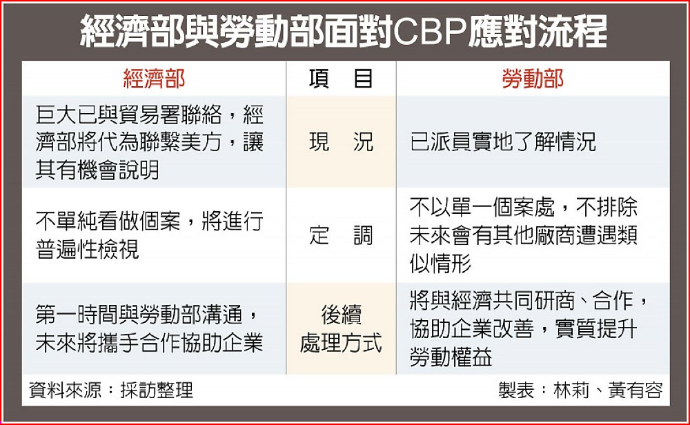 對美國海關暨邊境保護局(CBP)以「合理懷疑」為由對巨大公司產品進行暫扣令,政府部門高度關注。經濟部與勞動部聯手協助企業面對。經濟部長龔明鑫25日指出,第一時間就與勞動部部長洪申翰溝通,確認未來若有類似案件,都會和勞動部一起盡量協助企業。勞動部也表示,已派員前往巨大公司實地瞭解詳情,以盡快釐清美方所指涉之議題,後續將與經濟部共同合作,積極協助企業面對。