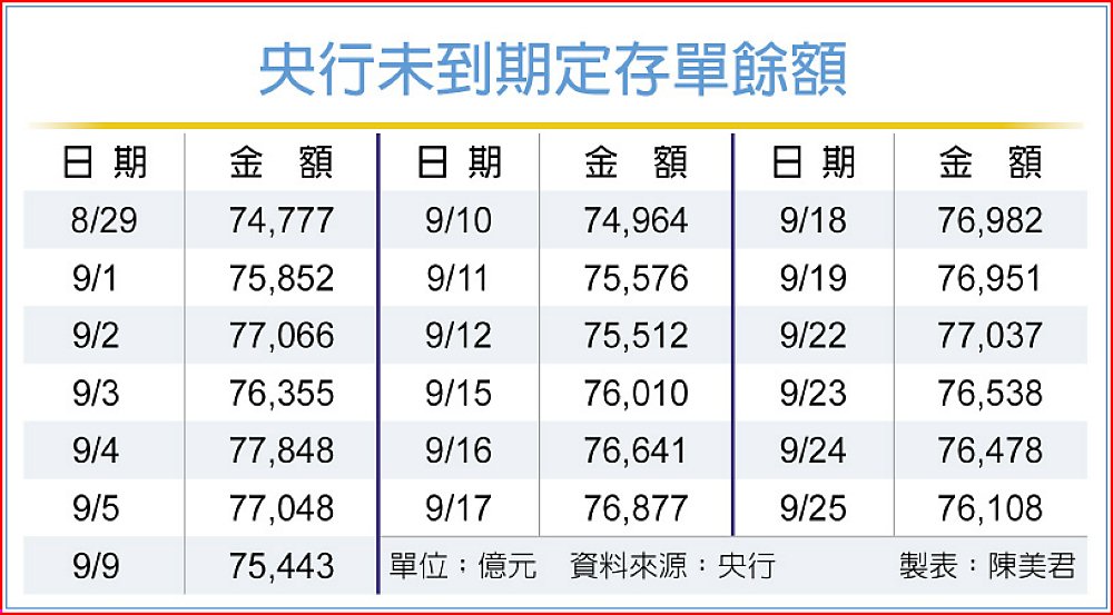 央行發行定存單是為沖銷市場多餘資金,避免資金過度充裕、助長通膨氣焰。今年8月底,央行定存單餘額僅7兆4,777億元,9月25日增至7兆6,108億元,顯示9月以來,央行增發約1,331億元的定存單,也就是從市場上多回收了逾1,300億元的資金。