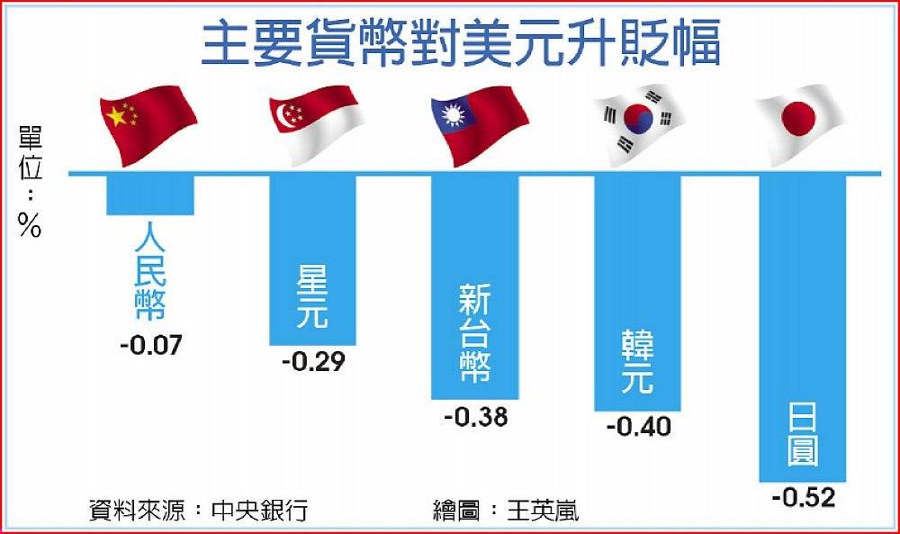 據央行統計,美元指數上漲0.4%,主要亞幣多數回貶,其中日圓匯率貶值0.52%、為最弱亞幣,台灣主要貿易對手國貨幣韓元也下挫0.4%,新台幣貶值0.38%約與韓元相當。另外,星幣下挫0.29%,人民幣表現最抗跌,僅貶值0.07%。