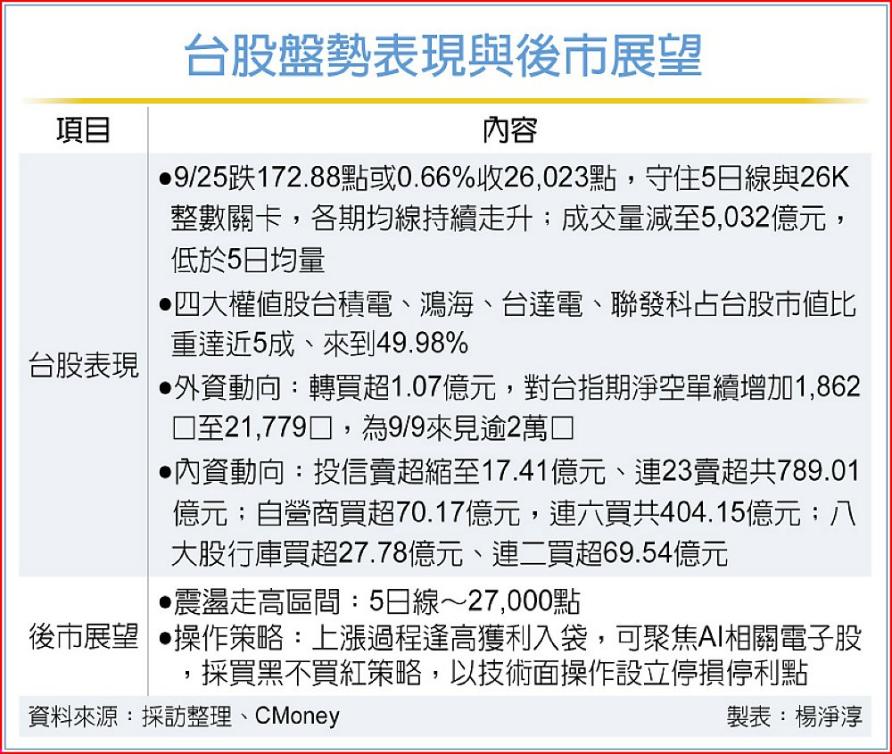 台股連日創歷史新高,加上第三季底即將來臨,25日盤面作帳VS.結帳火力交鋒,盤勢因此陷入高檔震盪,但量縮且力守5日線25,985點與26,000點整數關卡。法人表示,作帳與結帳互相交錯,盤勢震盪幅度加劇,但整體走勢未出現反轉訊號,有望震盪向上再戰新高。
