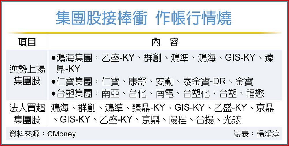 觀察25日盤面,多檔先前強勢個股表現降溫,資金則轉向其他個股作帳,鴻海集團方面,鴻海扮演撐盤要角,單日逆勢大漲3.14%來到230元,距離前高234.5元僅一步之遙,集團股的乙盛-KY、群創、鴻準等紛紛大漲3.16%~4.96%;仁寶集團方面,仁寶大漲超過半根停板,康舒、安勤、泰金寶-DR等也逆勢勁揚,台塑集團方面,南亞、台化、南電、台塑化、台塑等紛紛大漲2.23%~5.96%。