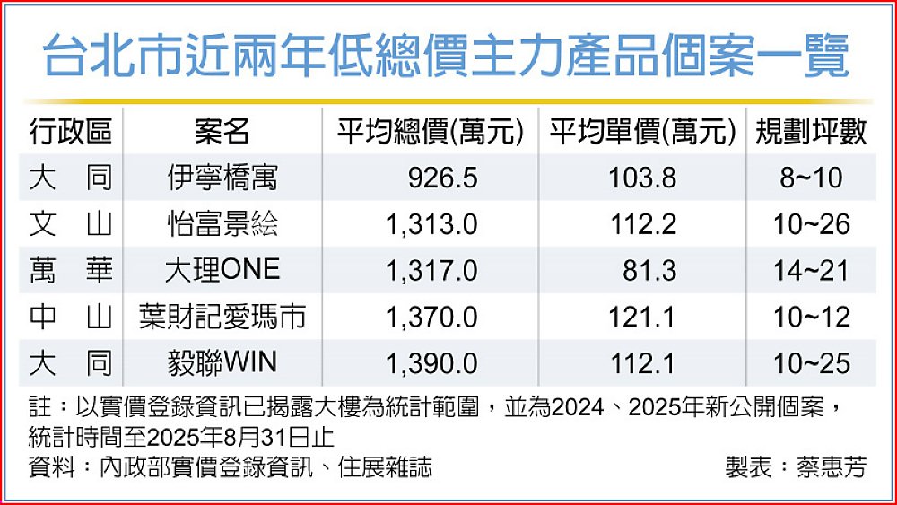依台北市近兩年實價登錄資訊觀察,低總價新案,只有5筆新案。以文山「怡富景繪」、萬華「大理 ONE」、中山「葉財記愛瑪市」,和大同「毅聯 WIN」等4筆來說,平均每戶總價約1,300多萬元;至於符合新青安首購族總價產品只有1筆,為大同小套房宅「伊寧橋寓」,平均交易總價為926.5萬元。