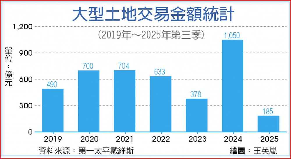 金龍海嘯後一年房市價量俱疲,全台土地市場面臨重創,最新調查顯示,2025年第三季土地市場成交額僅185億元,創下2016年房地合一稅上路以來近9年次低紀錄,累計前三季交易總額1,222億元,年減達4成。