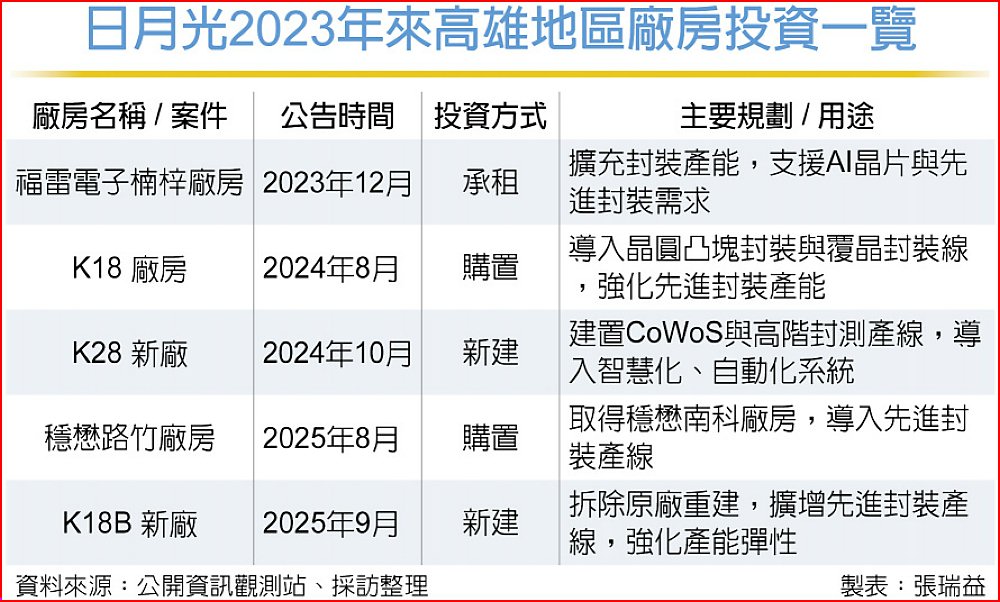全球封測龍頭日月光投控(3711)持續擴大先進封裝產能布局,25日宣布,旗下子公司日月光半導體董事會決議,將高雄K18B新廠房建設工程發包予關係企業福華工程,總金額達40.08億元。半導體供應鏈人士指出,日月光的K18B新廠工程是該集團近年在南部園區最大規模廠房建設之一,未來將因應未來AI、高效能運算(HPC)及先進封裝技術需求快速成長下的產能擴張計畫。
