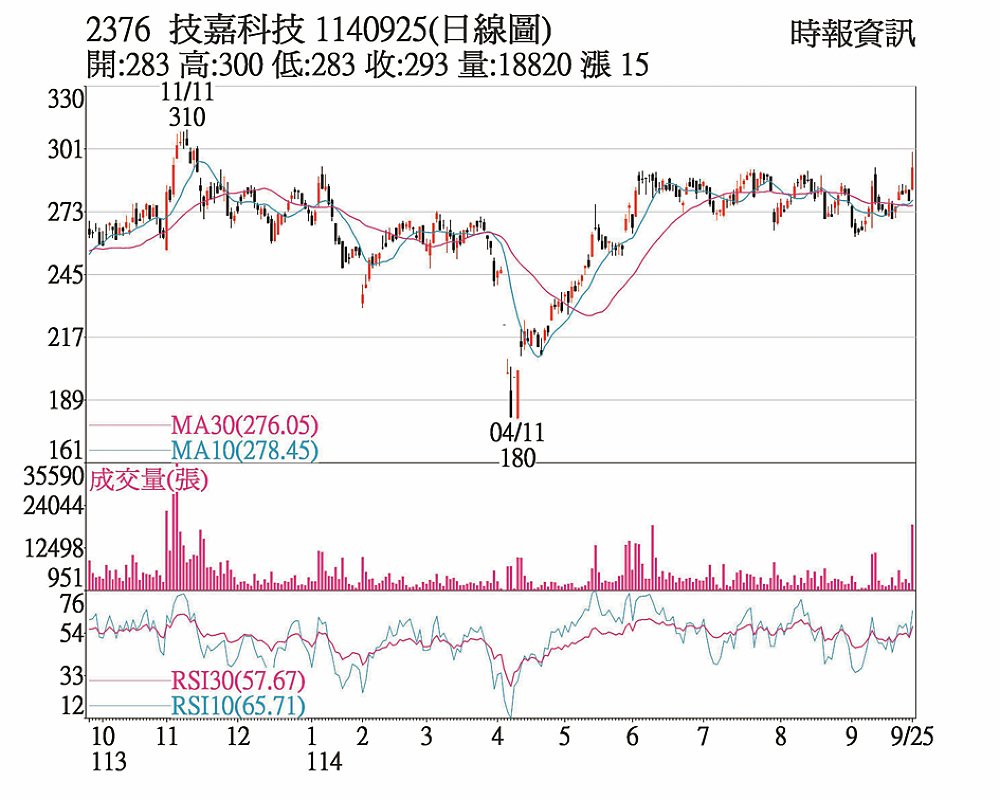 隨著旗下AI伺服器出貨題材加溫,及外資法人近日多站買方加碼下,技嘉股價25日帶量上攻3字頭,終場收293元、站10多月來高點,外資法人單日買超逾6,500張,若外資續站買方、股價站穩300元大關,將有望推助其挑戰330元壓力位。