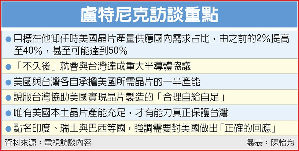 盧特尼克接受NewsNation訪問指出,半導體製造不能再過度集中於「距離中國80英里的島嶼」。他形容,美方思維是透過矽盾(silicon shield)確保供應安全,要求台灣與美國各承擔50%產能,以確保危機發生時,美方仍有能力維繫必要的晶片供應。