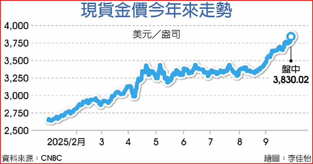 瑞銀集團(UBS)分析師史陶諾沃(Giovanni Staunovo)表示,「Fed未來六個月料進一步降息,我認為金價還有上漲空間,目標價在每盎司3,900美元。對美國政府停擺的疑慮,支撐黃金這類避險資產的需求。」
