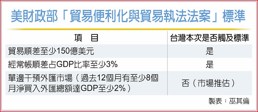 美國對匯率操縱國的檢視標準,一是對美國貿易順差逾150億美元;二是經常帳盈餘在GDP占比超過3%;三是淨買匯金額占GDP比率逾2%,且12個月中超過八個月為淨買匯。以國內貿易概況來看,根據美國財政部匯率政策報告的三項量化指標來看,台灣向來都觸及其中前兩項。