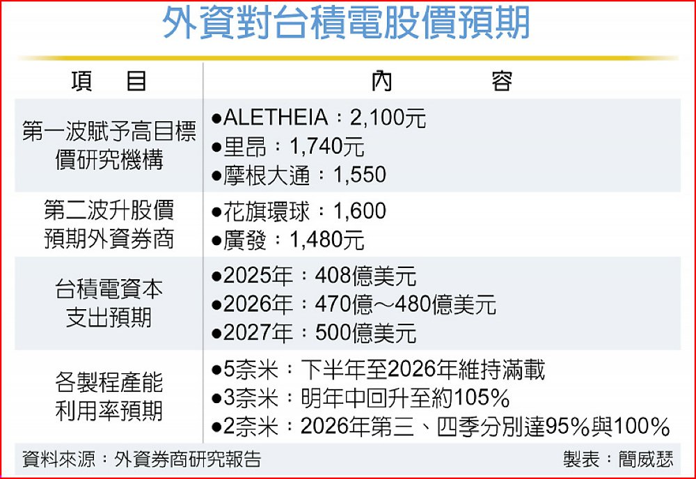 對應至資本支出,花旗環球證券估計,台積電今年資本支出為408億美元,2026、2027年將分別增加至470億美元與500億美元。摩根大通則預估台積電明年資本支出達480億美元,主要用在2奈米製程強勢擴產,至2026年底產能達每月6.5萬片;3奈米製程持續擴產,包含台灣廠區產能轉換,以及亞利桑那廠二期潛在擴產;同時,先進封裝資本支出亦將持續增加。