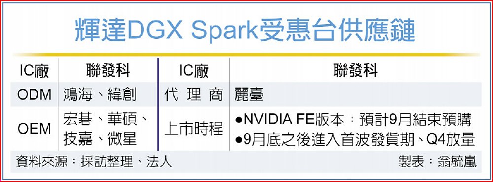 品牌廠中,除戴爾、惠普及聯想外,台四家PC品牌包括宏碁、華碩及技嘉、微星,皆已發表各自採用NVIDIA GB10超級晶片的首款個人迷你AI電腦產品。此外,輝達僅提供少數通路商代理經銷該款新品,而麗臺則為台灣目前唯一代理NVIDIA DGX Spark Founders Edition的業者。