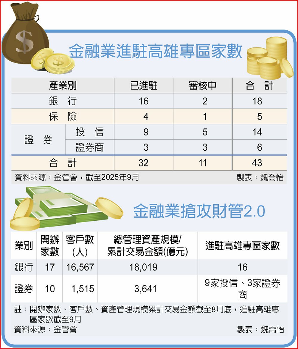 金融業積極搶進高雄專區陸續傳捷報。金管會統計,已有16家銀行、4家保險業、9投信、3券商等32家金融業獲准進駐高雄資產管理專區,其中,中信銀的家族辦公室服務已有近20組客戶申請,資產管理規模超過百億元。