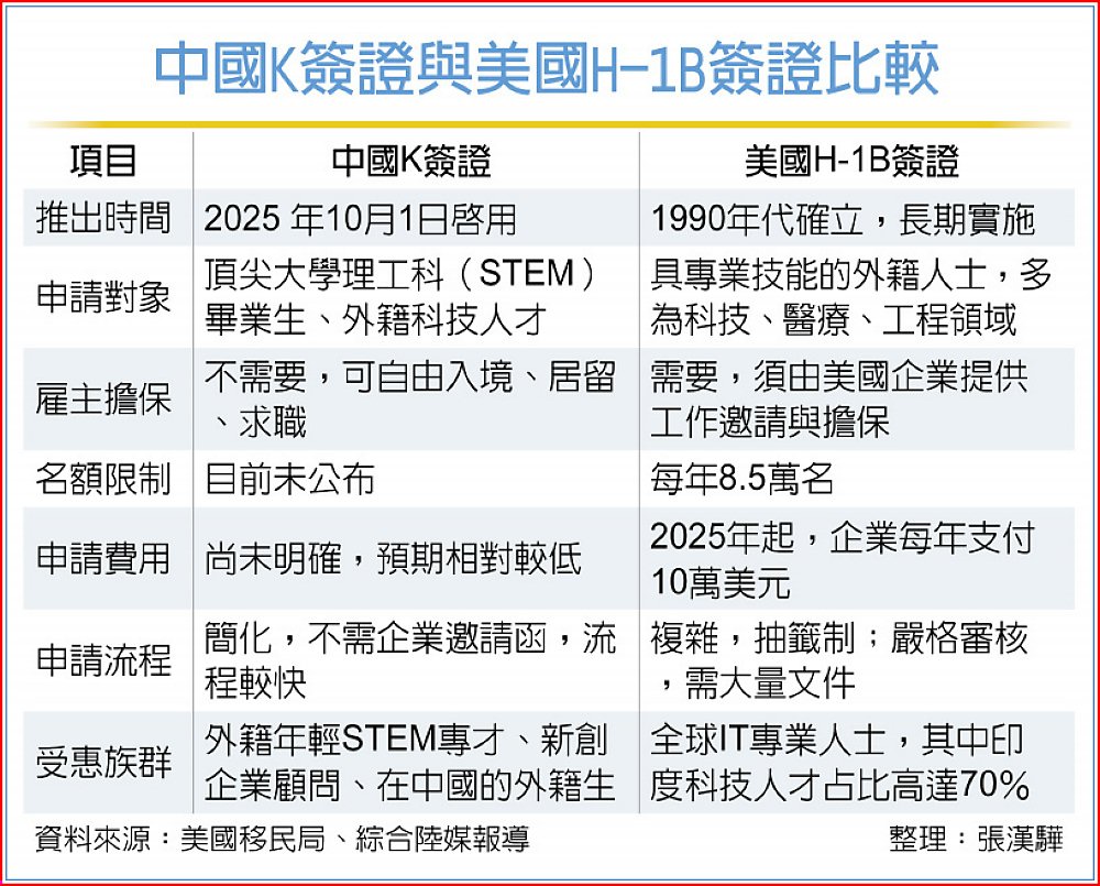 美國川普政府大幅調高外籍專才H-1B簽證費用之際,中國全新「K簽證」將於10月1日上路,鎖定頂尖大學理工科(STEM)畢業生,吸引其赴中求學、創業或商務,猶如現代版的「求賢令」。K簽證最大賣點是免除雇主擔保,北京藉此力壓放寬高技術移民政策的韓國、德國及紐西蘭,以利其爭取人才紅利。