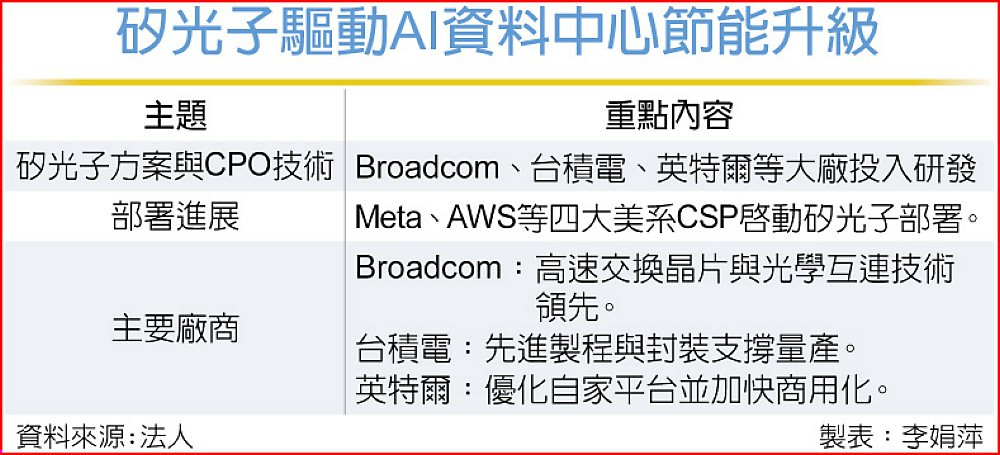 博通(Broadcom)與台積電兩強合作,從晶片架構與先進製程切入,推出矽光子(Silicon Photonics)解決方案,為全球雲端服務供應商(CSP)提供更高效的資料中心互連方案。