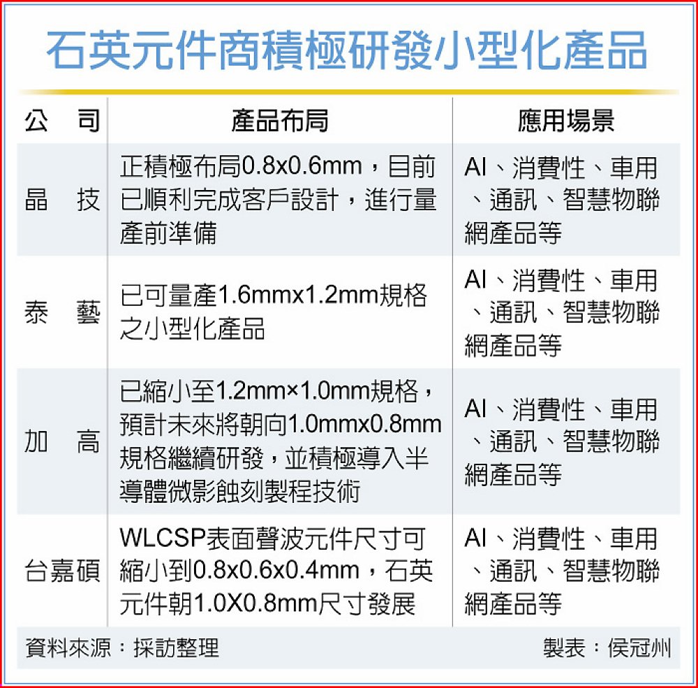 AI、B5G、6G與物聯網(IoT)應用加速普及,驅使石英元件掀起小型化潮流,台系業者晶技(3042)、泰藝(8289)、加高(8182)和台嘉碩(3221)等,皆積極投入高頻、微型、低功耗產品,搶攻AIoT、行動通訊與消費性電子等龐大商機。